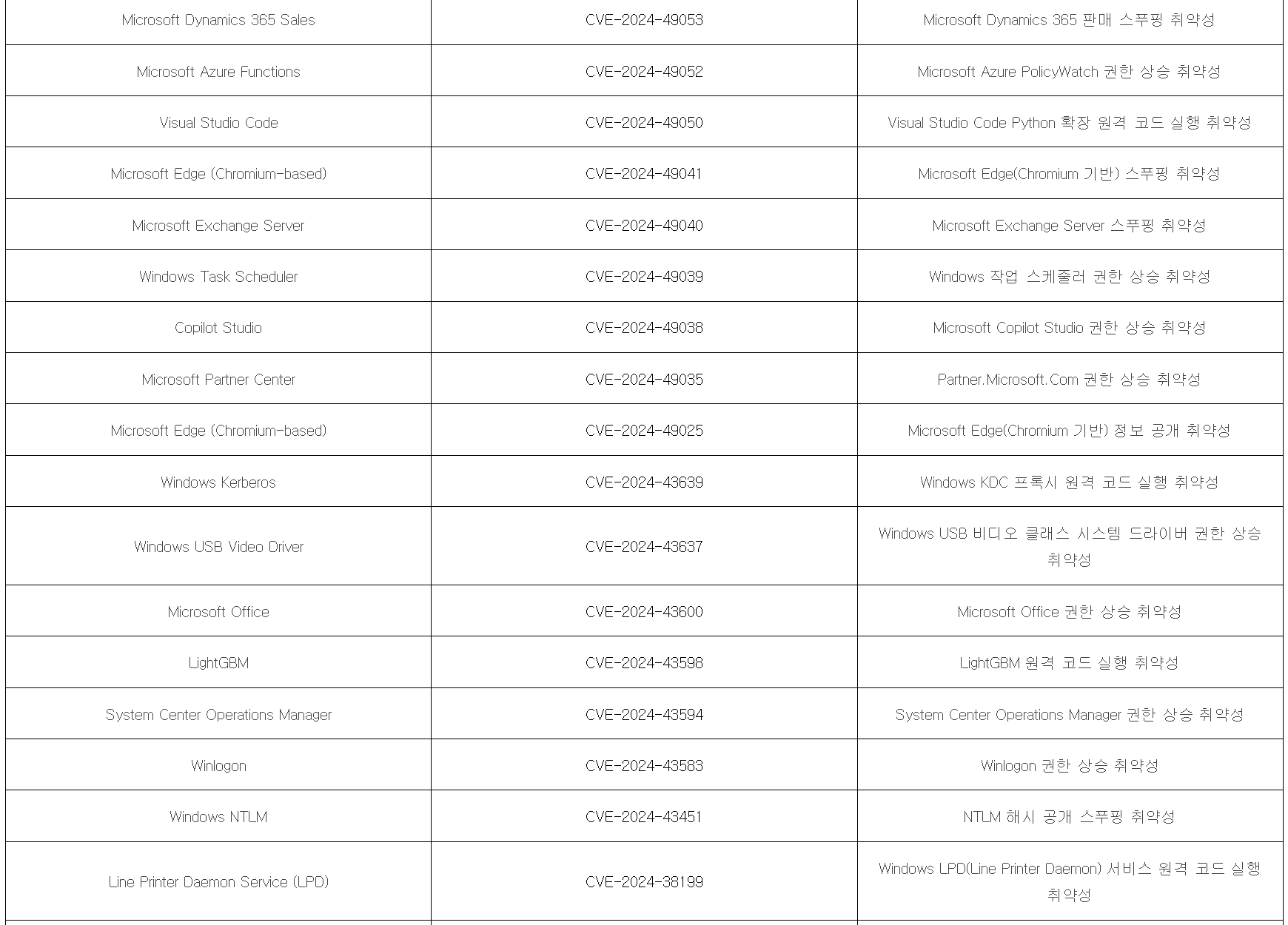 | TITLE | [MS 보안업데이트]2024년 12월 보안 위협에 따른 정기 보안 업데이트 권고 |